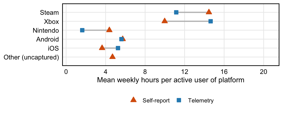 Figure 4 compares the average self-reported distribution of play across platforms to the distribution in our digital trace data capture. It is vital to note that the self-report data not be treated as ground truth: we have good evidence that people’s self-reports of media use are inaccurate (Kahn et al., 2014; Parry et al., 2021), with some previous work finding systemic overestimation of video game play (Johannes et al., 2021). Nonetheless, it is likely that some portion of players’ true gaming is systematically uncaptured, due to factors such as missing titles (e.g., Nintendo third party), or player privacy settings (e.g., playing in invisible mode; setting certain games to private on Steam). The figure therefore provides a useful overview of the relative coverage of different platforms in our telemetry data.