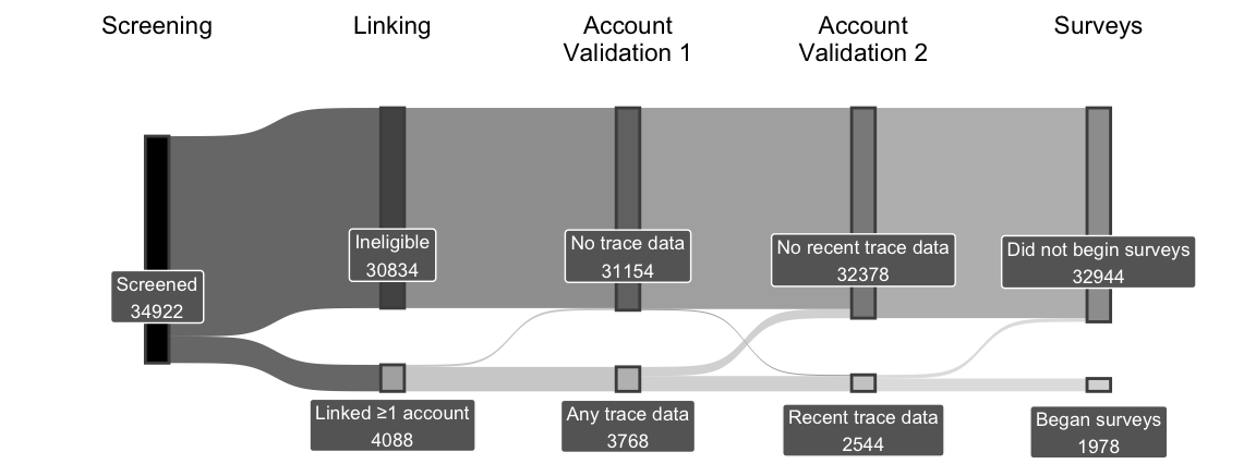 | a N subjects can exceed N survey subjects because some participants (1) provided digital trace data that was not recent enough to qualify, or (2) provided recent digital trace data but did not return for subsequent surveys. | ||||||