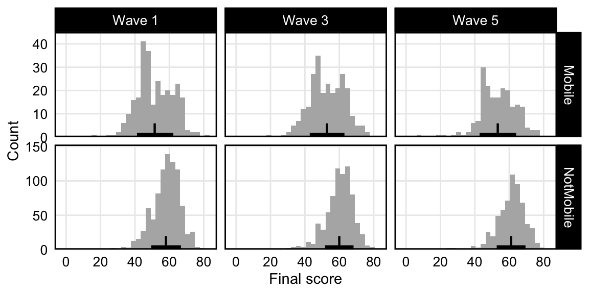 Overall, 1149, 991, and 800 participants completed the Simon task at biweekly waves 1, 3, and 5. The average performances were approximately 10 points lower than in the in-person study of Burgoyne et al. (2023) (Figure 16). Participants on mobile devices generally attained lower scores than those not on mobile devices (Figure 6, rows), but performance was generally stable across the three waves (Figure 6, columns).