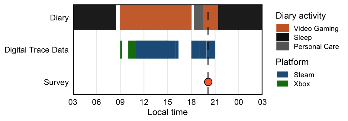 Figure 7 presents an illustrative example of one participant’s time use diary for a single day, alongside their gaming sessions recorded through telemetry and survey completion time.
